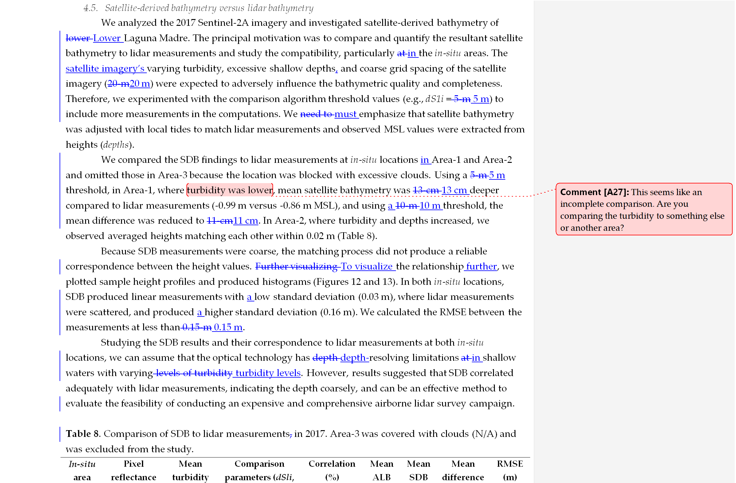 An example of tracked changes in the text of a peer-reviewed journal article, correcting clarity and grammar.